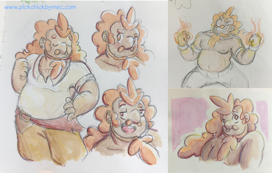 Aquí hay algunos concept de ir pillándole soltura al personaje una vez lo conseguimos definir (la primera es de él de joven, ahí sedussiendo fuerte):