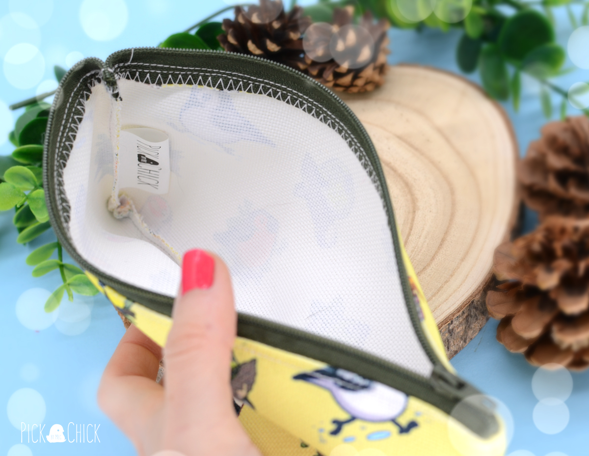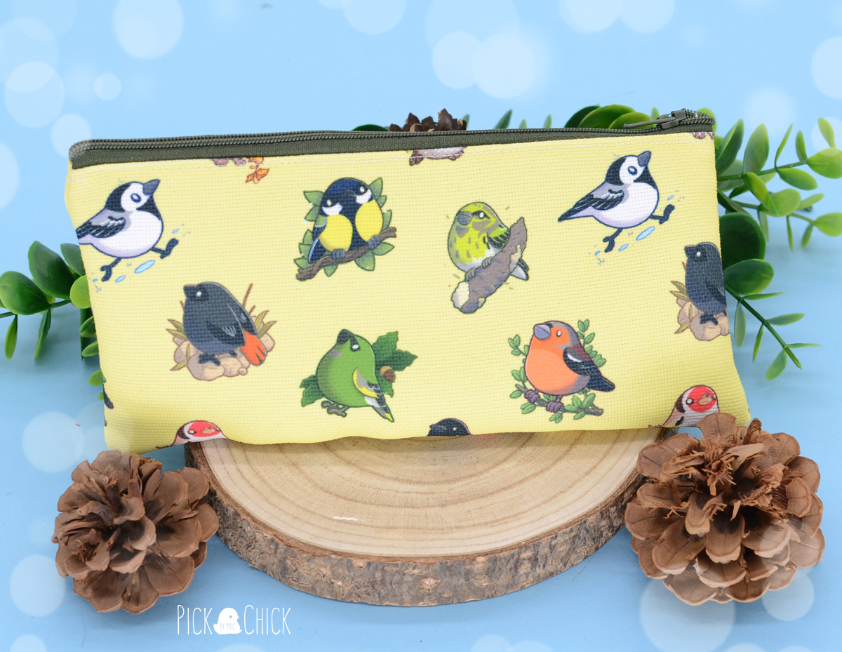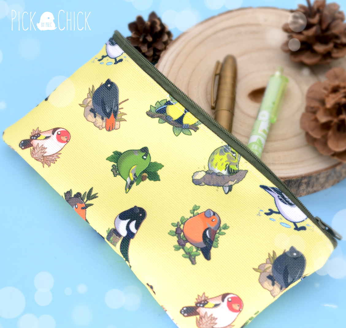 Estuche de estilo kawaii hecho a mano con estampado protagonizado por varios pajaritos. Todas las ilustraciones de este portalápices están sacadas del fanzine ¿Qué es ese pollo? Guía de aves urbanas españolas, y representan distintos pájaros que podemos encontrar de forma común en nuestros pueblos y ciudades. El fondo amarillo le da un toque cálido y alegre al producto. Esta pieza es ideal para cualquier amante de la ornitología y de las cositas monas, y será muy útil para llevar las herramientas de dibujo al campo y tomar apuntes de nuestros amigos con plumas. El estuche es de tela de sarga muy suave, lleva cierre de cremallera y está completamente cosido a mano por mi. La impresión es de gran calidad, con tonos brillantes y perfiles bien definidos.