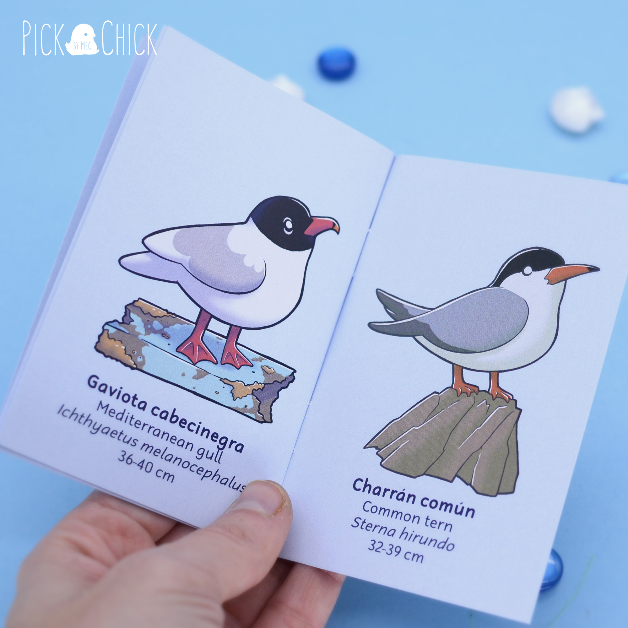 Este fanzine es una guía de aves comunes de zonas acuáticas de la península ibérica. Tras el éxito del primer ¿Qué es ese pollo? decidí seguir con estos libritos sobre identificación de aves, así que aquí va la segunda parte. Esta vez el fanzine es temático de aves que podemos encontrar en ríos, acuíferos y costas de la península ibérica. En el mismo formato que el anterior, e igualmente lleno de pajaritos bonitos, esta guía nos ayudará a identificar algunas de las especies más comunes que habitan en nuestro territorio. Contiene 18 pájaros distintas con su nombre común en castellano, inglés y científico. Las ilustraciones de aspecto adorable y redondito se inspiran en el estilo kawaii, pero sin dejar de ser reconocible. Tanto si eres un amante de la ornitología como si quieres iniciarte en ella y conocer mejor la fauna que te rodea, este librito es perfecto.