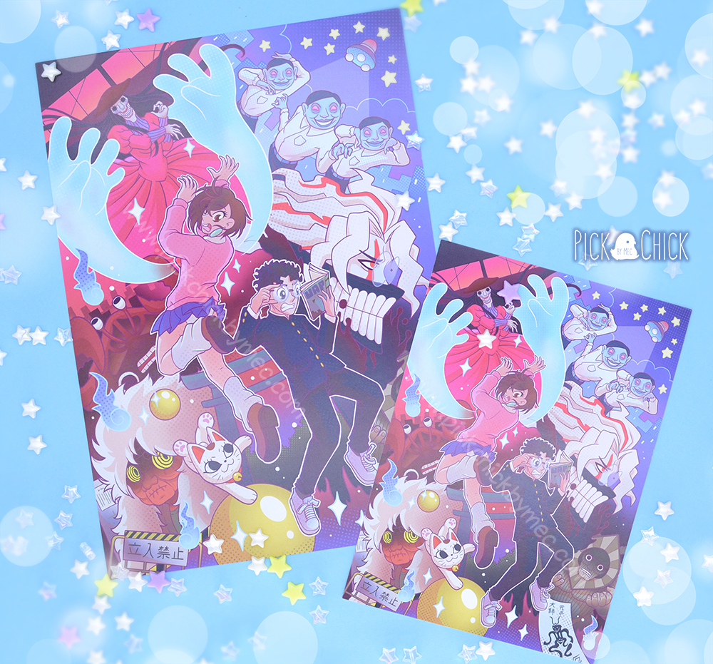 Esta lámina es una copia impresa de una de mis ilustraciones digitales, un fanart del anime y manga Dandadan. La ilustración se basa en la primera temporada del anime. Muestra a los protagonistas de la historia junto a algunos de los extra más característicos y populares, todo ello representado en una escena de composición dinámica y llena de tonos vibrantes con efectos de semitono.
