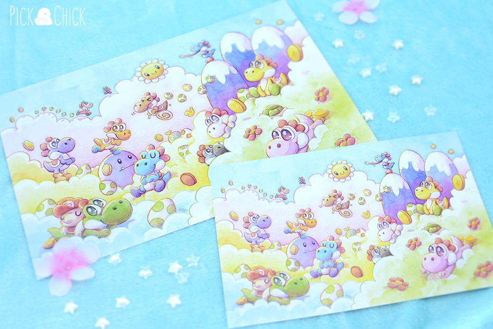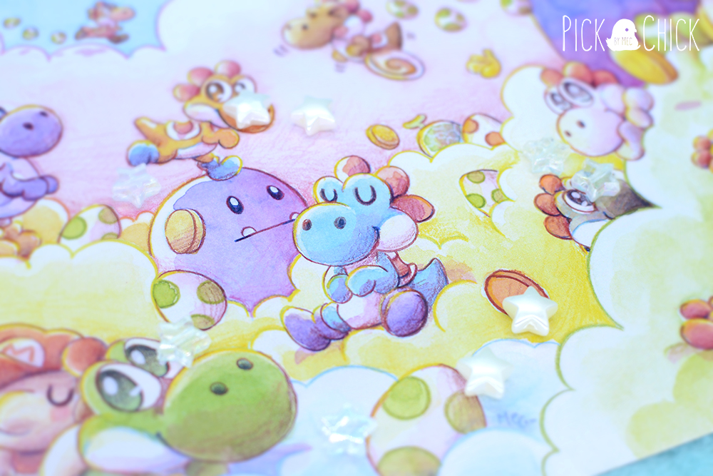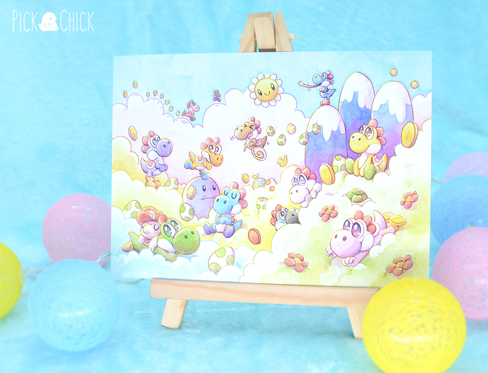 Esta lámina es una copia impresa de una de mis ilustraciones en acuarela inspirada en todos los Yoshi de colores del videojuego Yoshi’s Island. Aparecen todas las variaciones del protagonista que podemos encontrar en diversos videojuegos junto al bebé Mario. Tanto los colores vivos y luminosos que le da la acuarela como la temática encajan a la perfección en el ambiente onírico entre todas esas nubes.