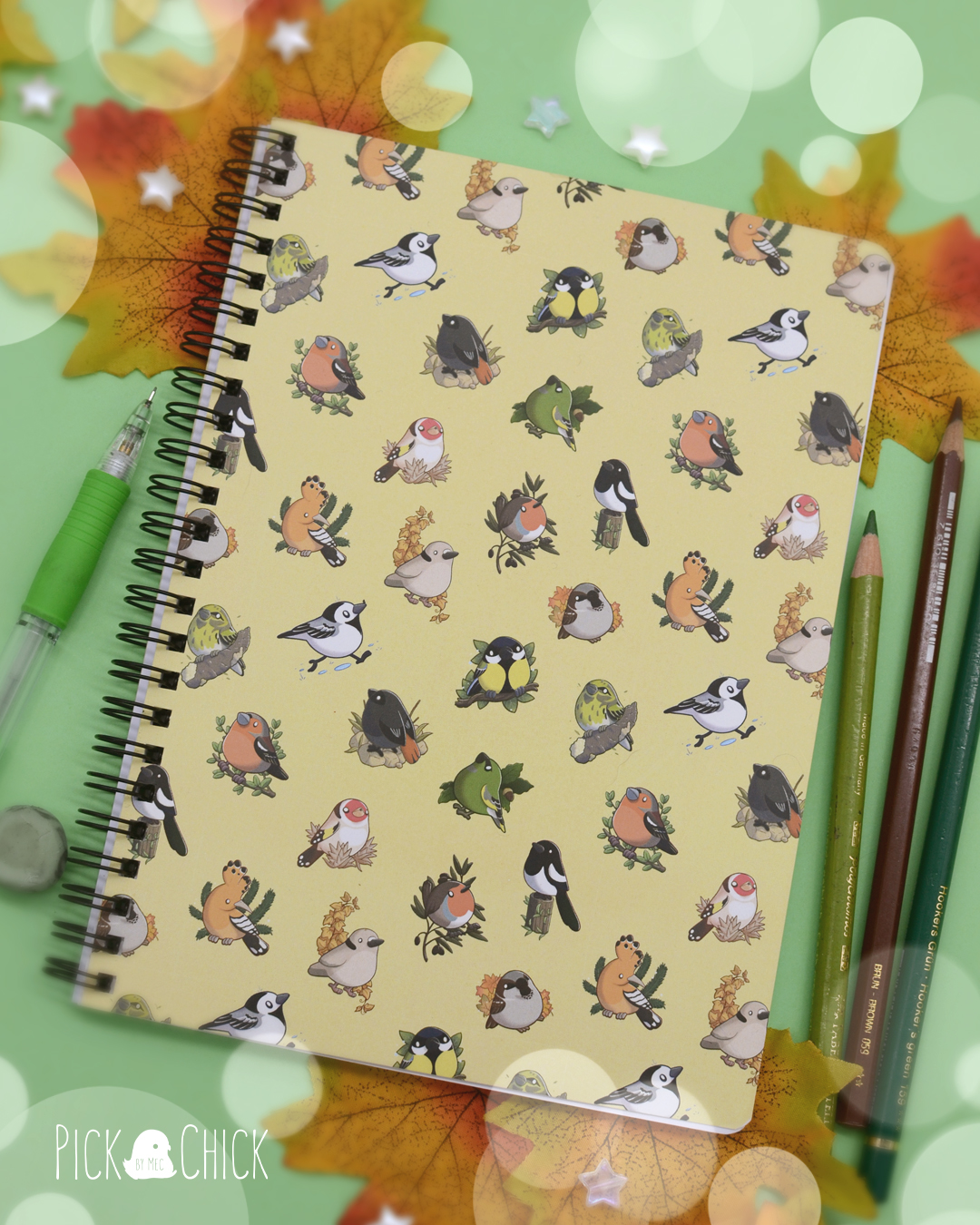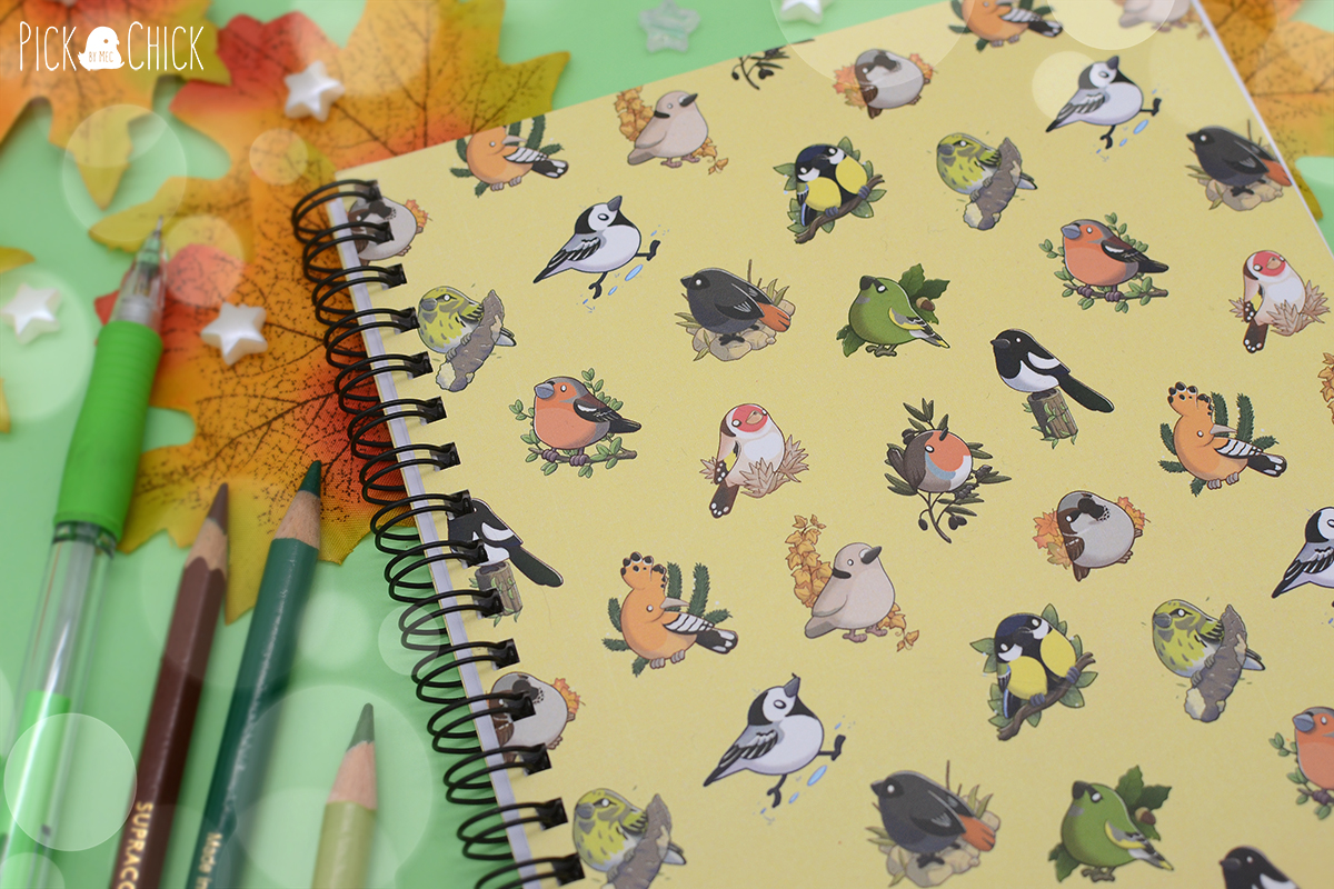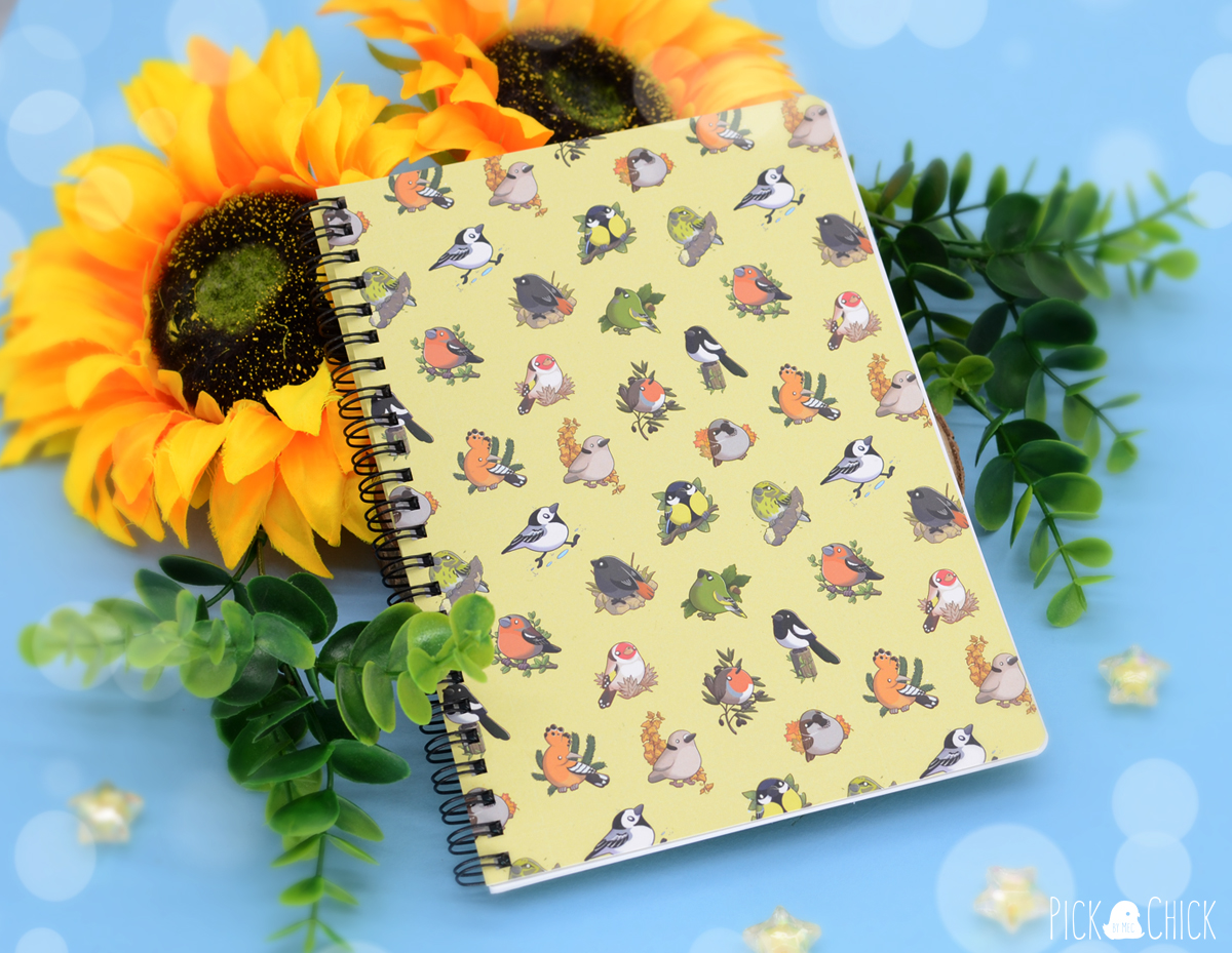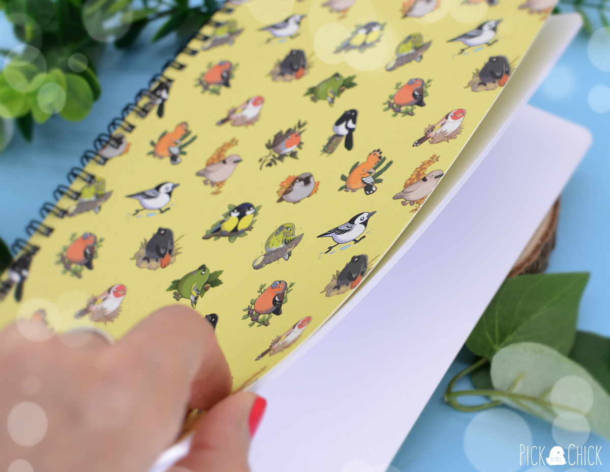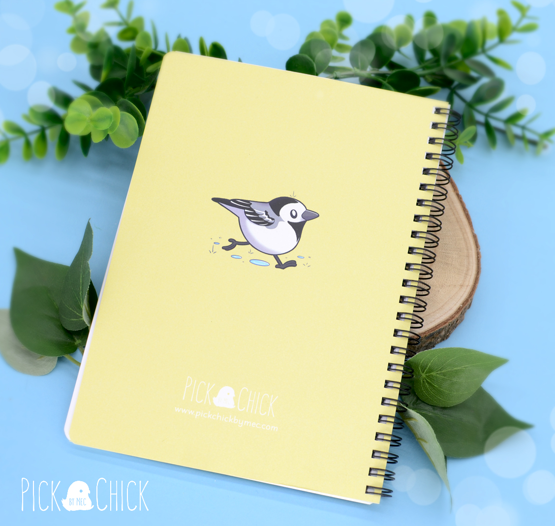 Anota tus ideas, tus apuntes de clase o llena de dibujos esta libreta de diseño inspirado en varios pajaritos en estilo kawaii. La portada está impresa con un estampado de distintas aves urbanas (todos pertenecientes al fanzine ¿Qué es ese pollo?), y la contraportada muestra a una lavandera. El formato A5 permite que puedas llevarla cómodamente a cualquier parte que necesites y las cubiertas van laminadas para hacerlas más resistentes y mucho más agradables al tacto. Las hojas interiores son completamente blancas, por lo que se adaptará perfectamente al uso que quieras darle. Si eres un fan de la ornitología y te quedas embobado mirando cualquier pajarillo que te encuentras por la calle este cuaderno es para ti.