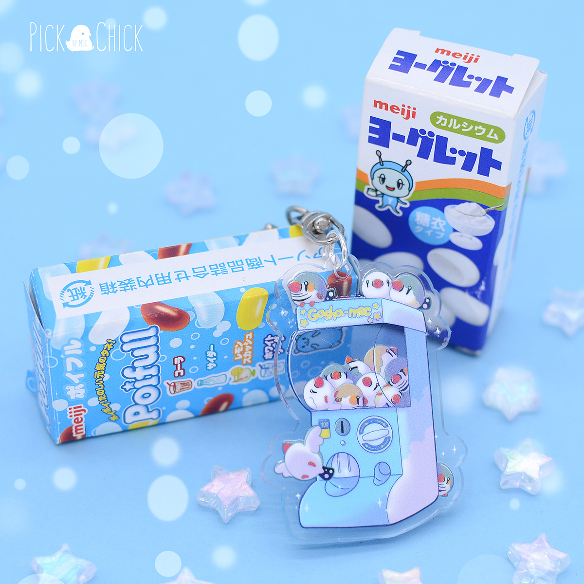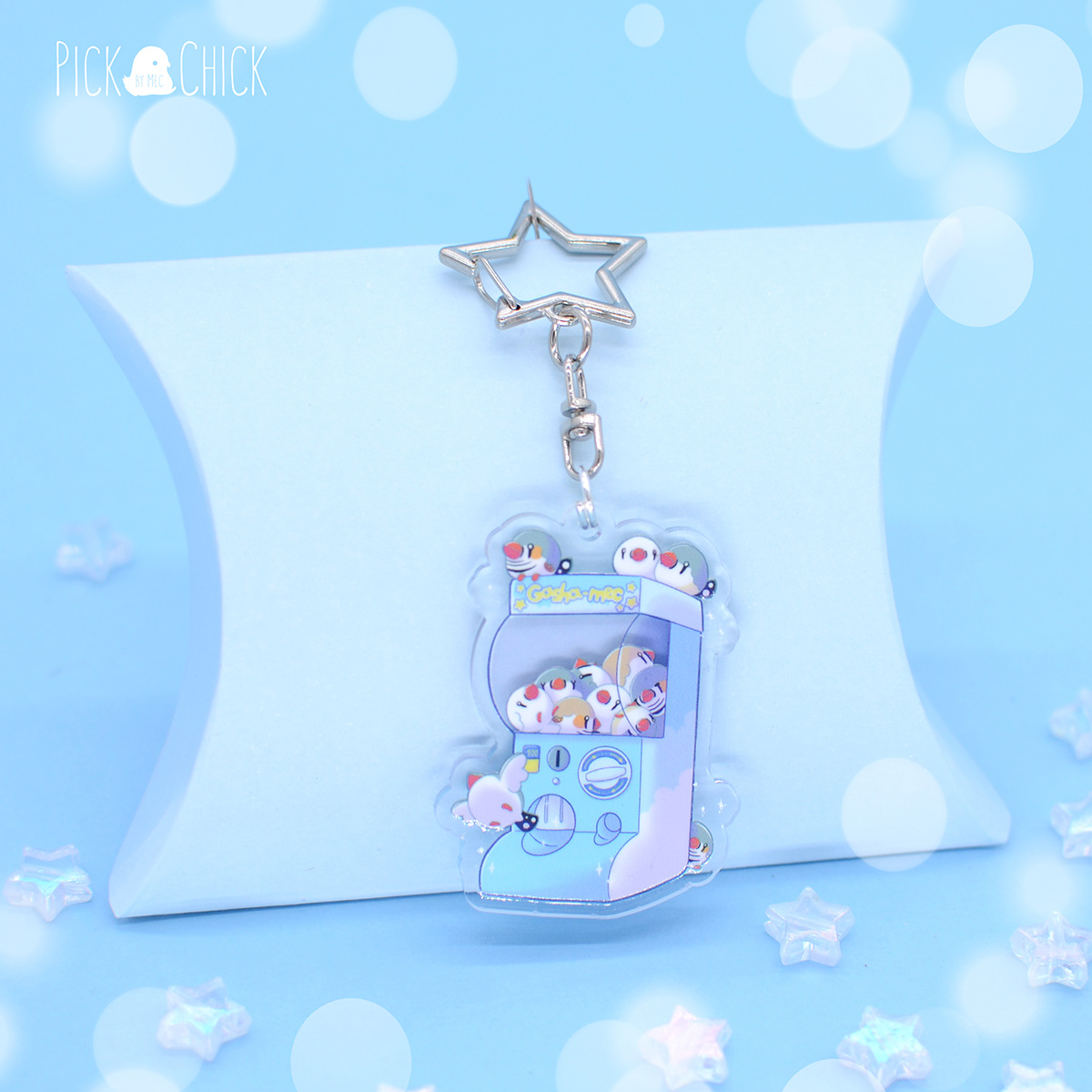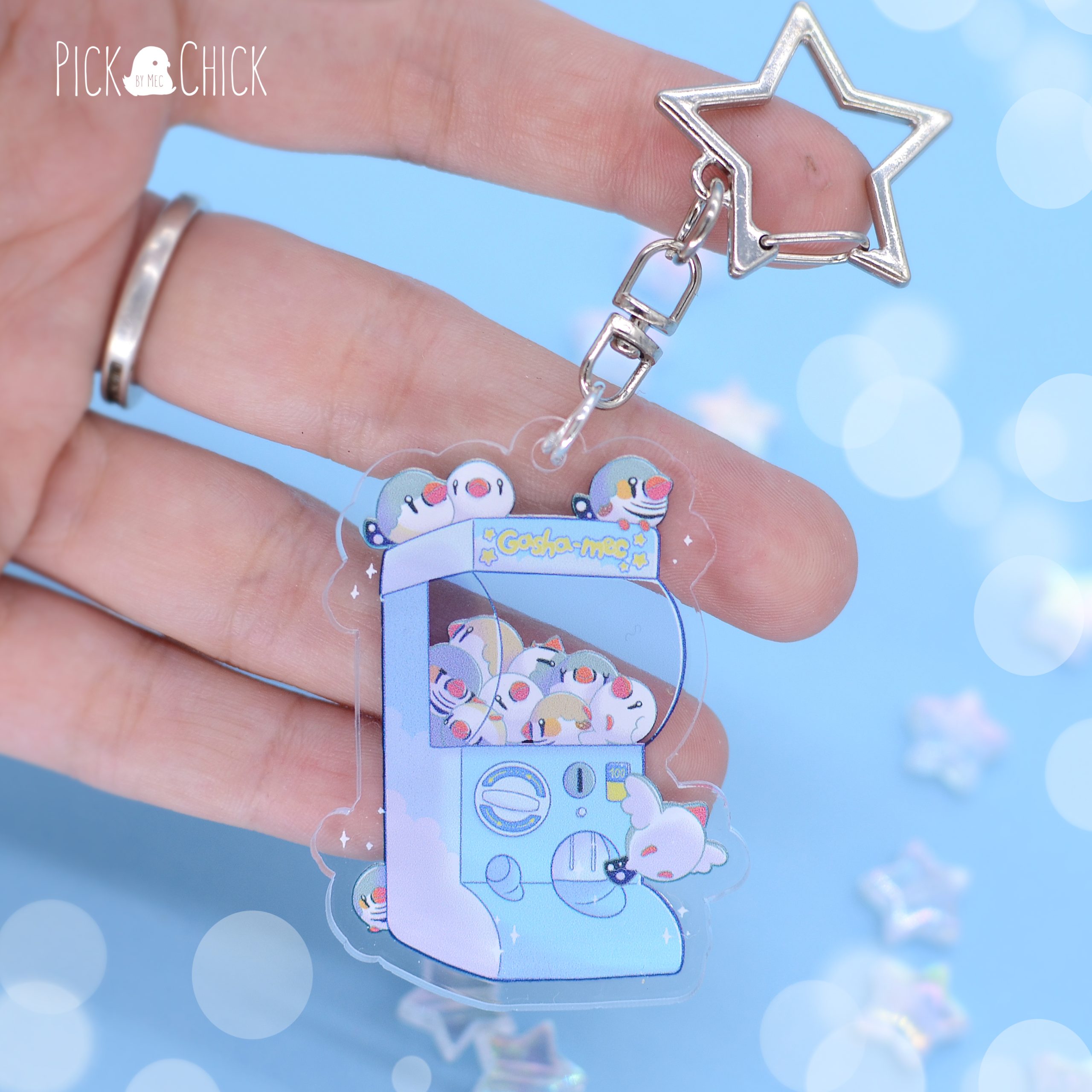 Llavero acrílico de estilo kawaii con diseño inspirado en el clásico juego de gachapon japonés y el diamante mandarín. Una expendedora de cápsulas sorpresa llenita de distintas mutaciones de color de diamantes mandarines, una de las aves más populares como mascota y todos igual de adorables. La zona de metacrilato por donde se ven las bolitas es semitransparente en el llavero, y la parte de plástico opaco tiene un bonito estampado de nubes que aportan sensación de calma al diseño. Este llavero le dará un toque súper kawaii a tus llaves, tu bolso o mochila allá donde vayas, y es ideal para cualquier amante de estas aves.