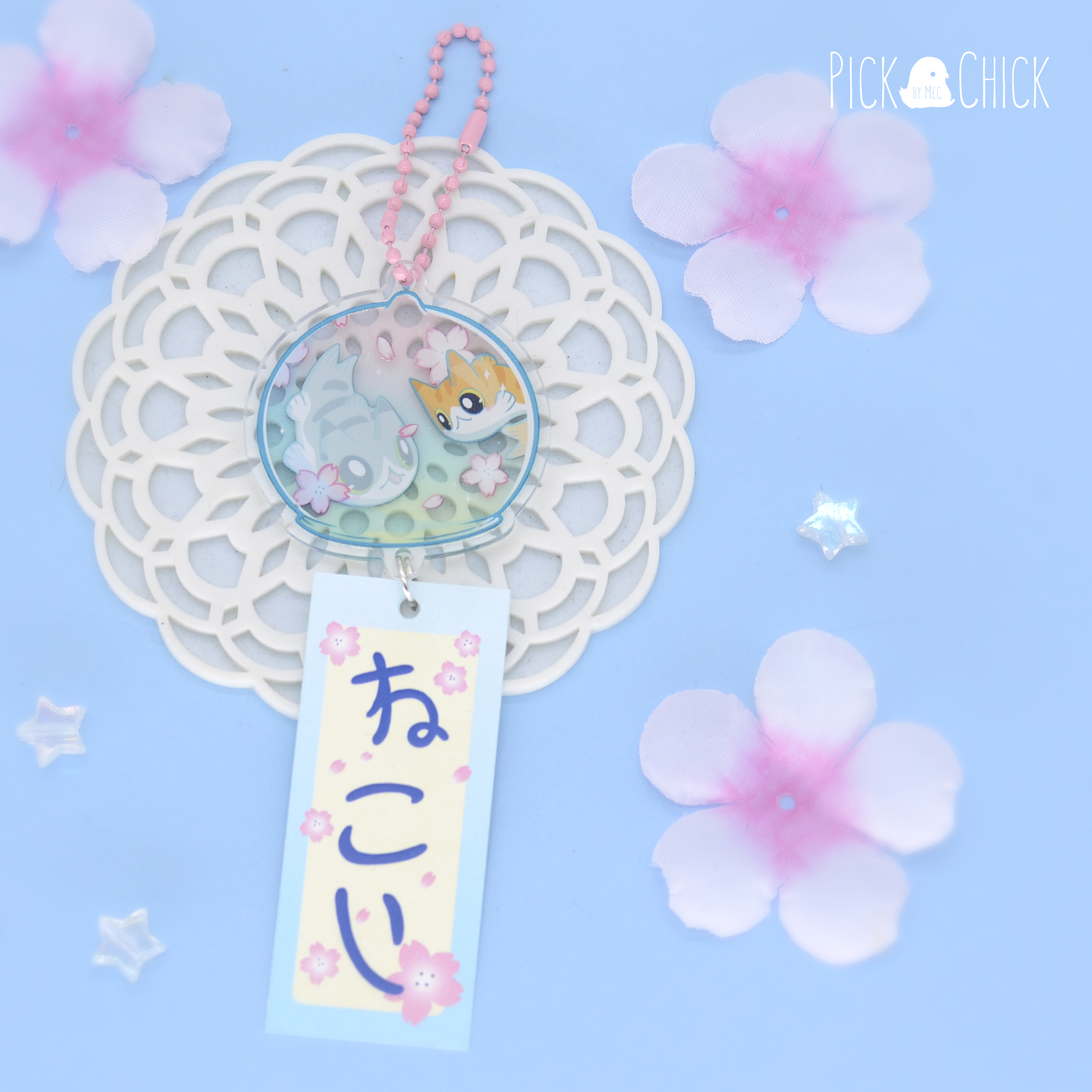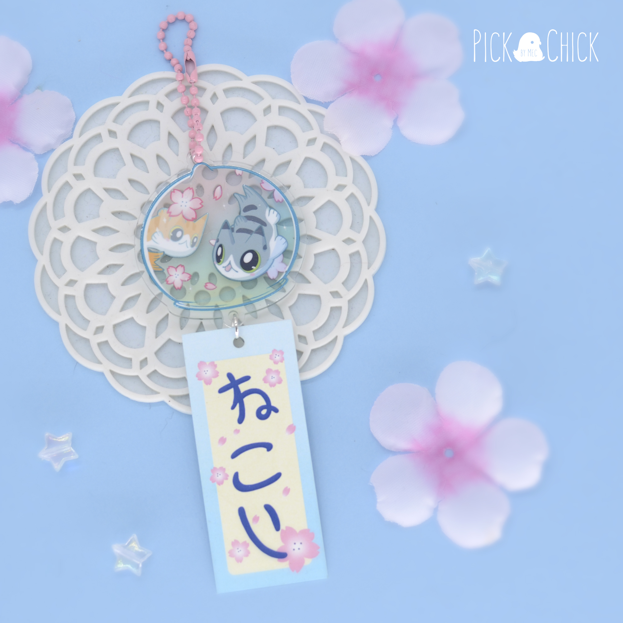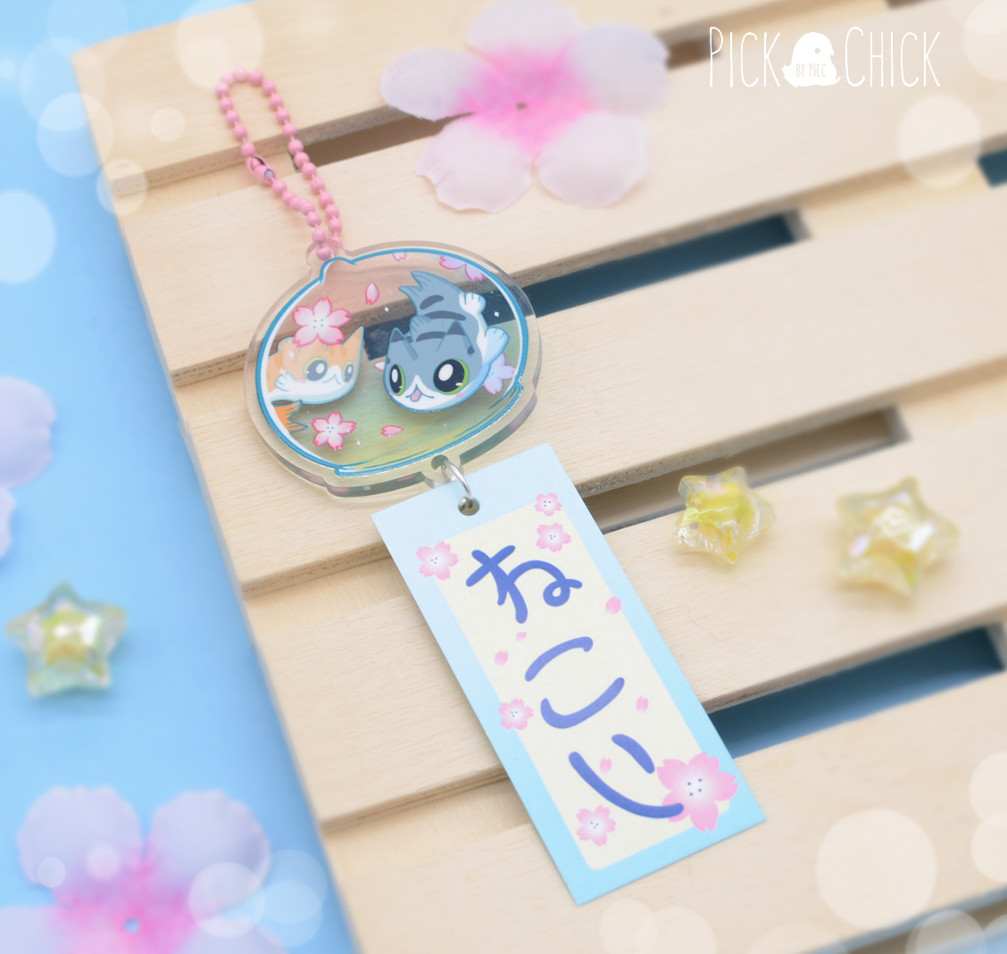 Llavero acrílico de estilo kawaii inspirado en nuestro personaje Nekoi y en una campanita japonesa furin. El llavero entero simula ser este tipo de campanita que suena gracias al viento que la mece y que tiene un sonido tan característico de Japón. La pieza acrílica es casi toda translúcida, con un sutil degradado en tonos pastel, y tiene dos nekoi estampados con florecitas de Sakura. El diseño es distinto por cada lado, siendo el mismo dibujo pero con partes menos saturadas para potenciar el efecto de ser una campanita real. El rectángulo colgante es de poliéster fino, así parece papel pero es mucho más resistente y no le pasa nada si se moja. Este llavero dará un toque alegre y kawaii a cualquier bolso o mochila de donde lo cuelgues.