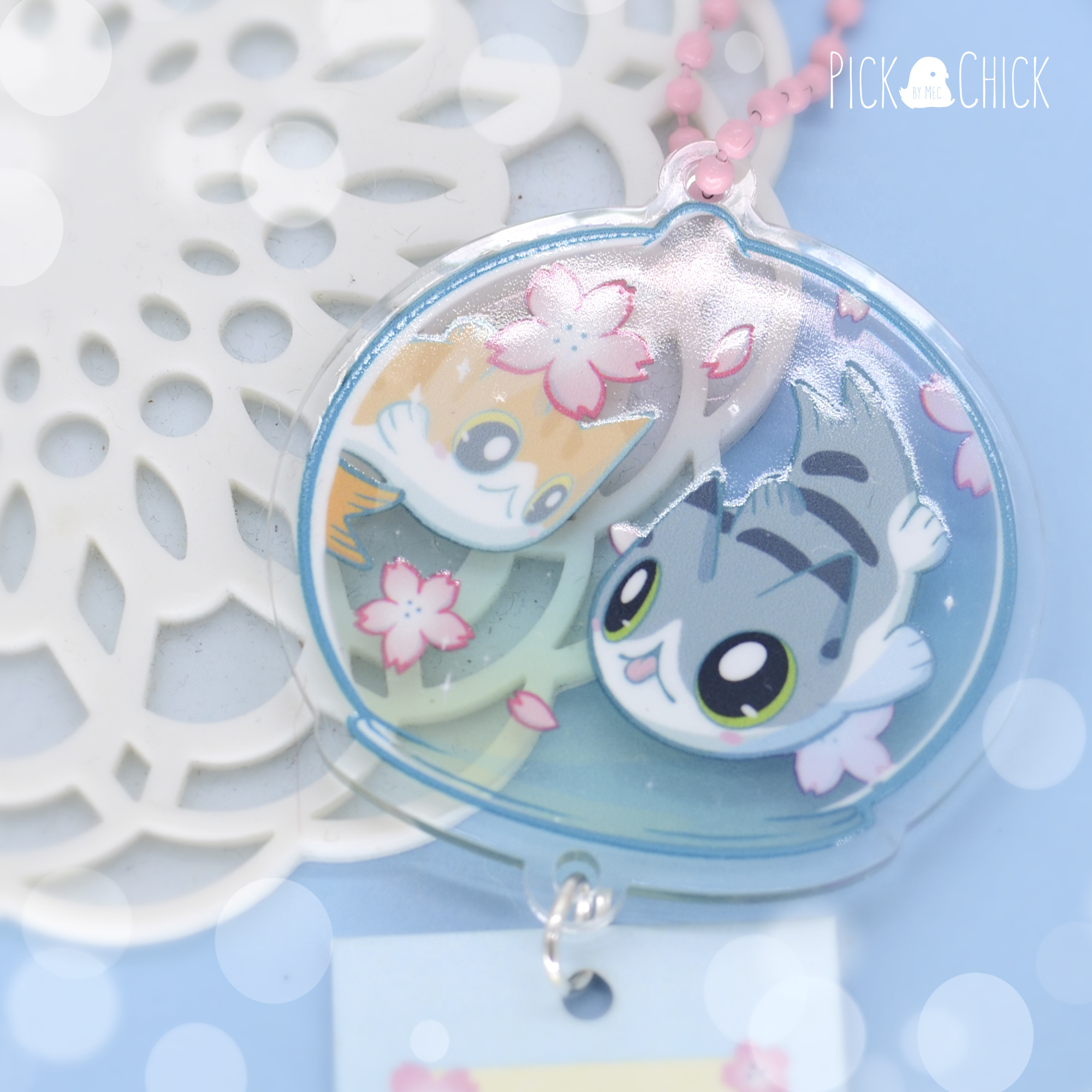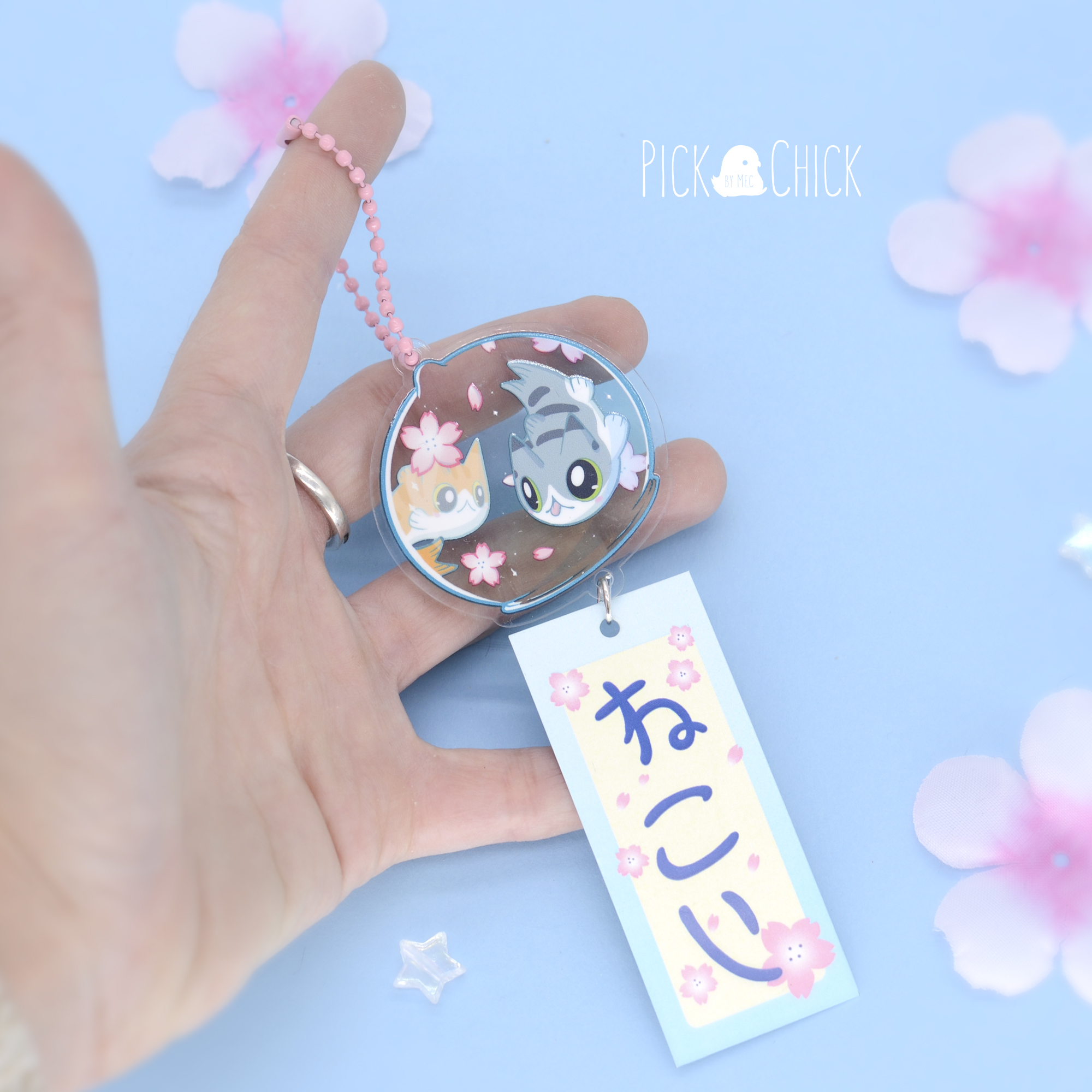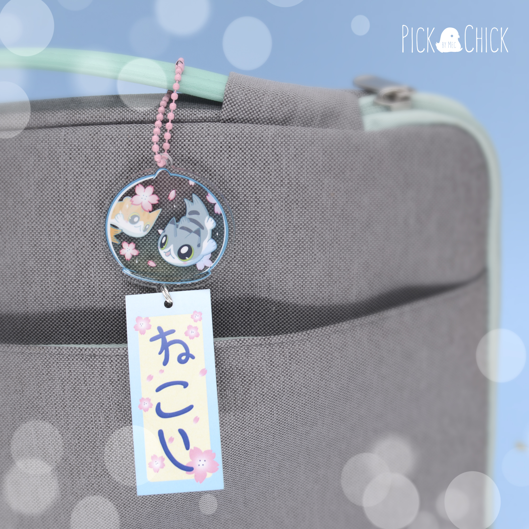 Llavero acrílico de estilo kawaii inspirado en nuestro personaje Nekoi y en una campanita japonesa furin. El llavero entero simula ser este tipo de campanita que suena gracias al viento que la mece y que tiene un sonido tan característico de Japón. La pieza acrílica es casi toda translúcida, con un sutil degradado en tonos pastel, y tiene dos nekoi estampados con florecitas de Sakura. El diseño es distinto por cada lado, siendo el mismo dibujo pero con partes menos saturadas para potenciar el efecto de ser una campanita real. El rectángulo colgante es de poliéster fino, así parece papel pero es mucho más resistente y no le pasa nada si se moja. Este llavero dará un toque alegre y kawaii a cualquier bolso o mochila de donde lo cuelgues.
