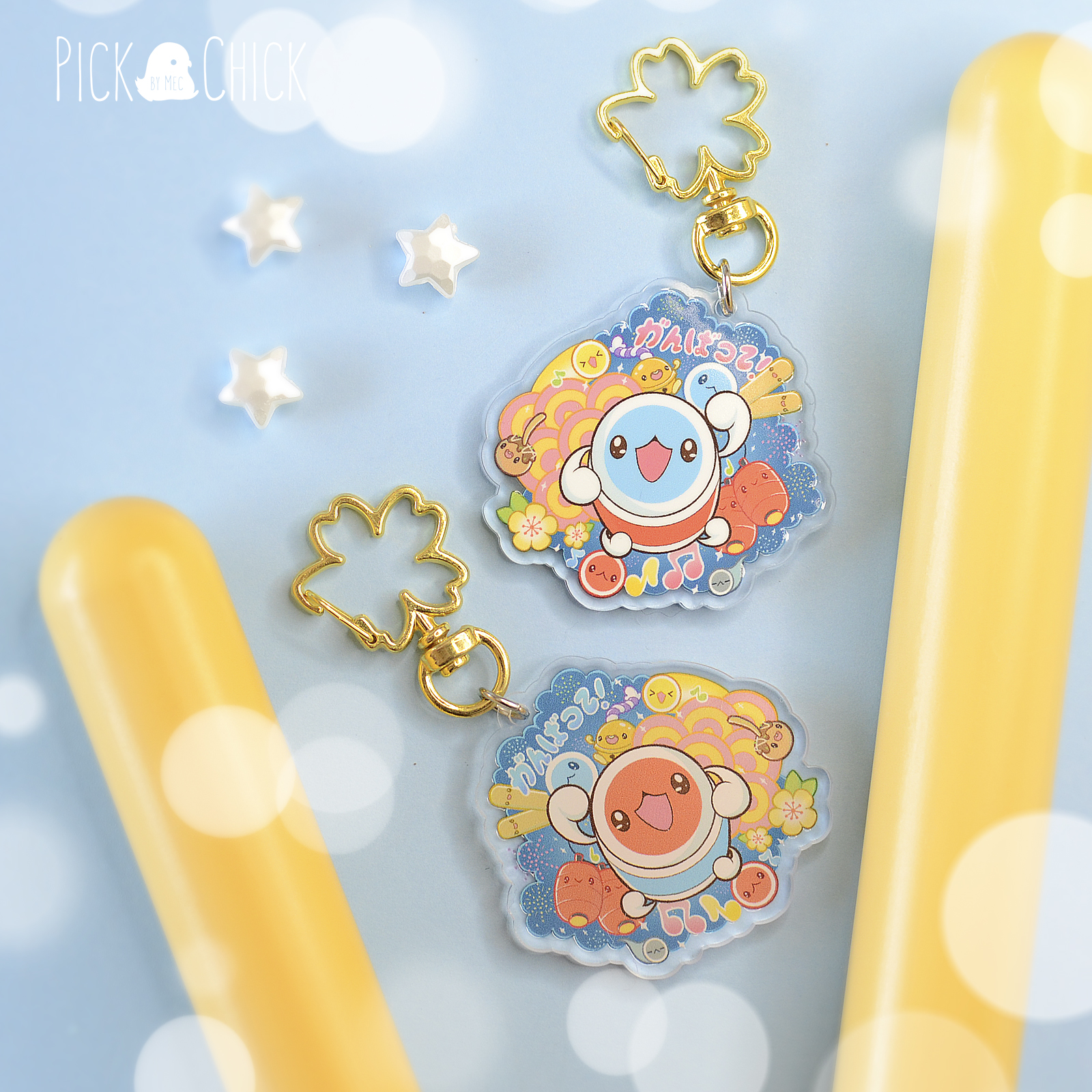 Llavero acrílico de estilo kawaii inspirado en el videojuego japonés arcade Taiko no Tatsujin. Diseño alegre y detallado que muestra al tambor taiko protagonista rodeado de elementos que nos recuerda a los festivales matsuri que se celebran en Japón. También podemos leer la frase Ganbatte! (esfuérzate, o da lo mejor que puedas traducido al español). El llavero va impreso a doble cara, y cada lado es distinto: por un lado tenemos a Don, el tambor azul de cara roja, y por el otro a Katsu, el tambor rojo con cara azul. Este llavero dará un toque alegre y friki a cualquier parte de donde lo cuelgues, ya sea de tus llaves, bolso o mochila.