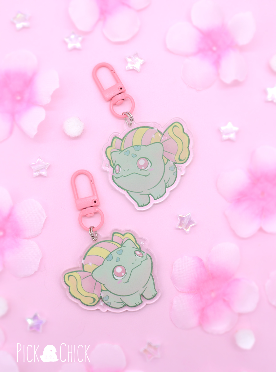 Llavero acrílico de estilo kawaii inspirado en Pokémon y diferentes dulces. Puedes elegir entre distintos modelos, por el momento hay dos disponibles. Tenemos primero a Bulbasaur, que en vez de bulbo lleva un caramelo gigante a la espalda, y a Piplup, comiéndose un taiyaki con helado en forma de Magikarp. Ambos llevan cierre de mosquetón con un color distinto según combine con el diseño ( el de Piplup en azul claro y el de Bulbasaur en rosa pastel). Si eres fan de la franquicia y te pueden los pasteles y los dulces esta colección es para ti.