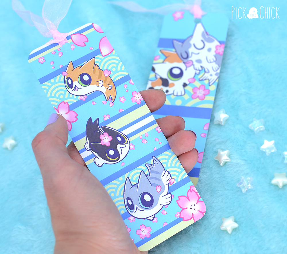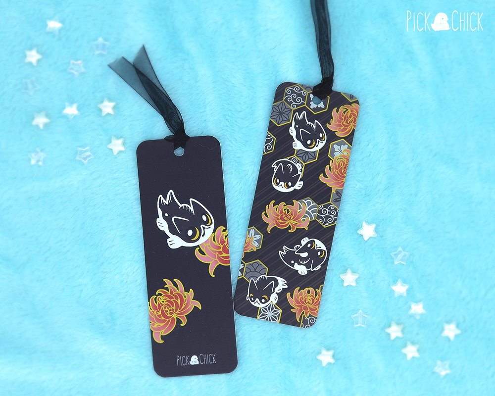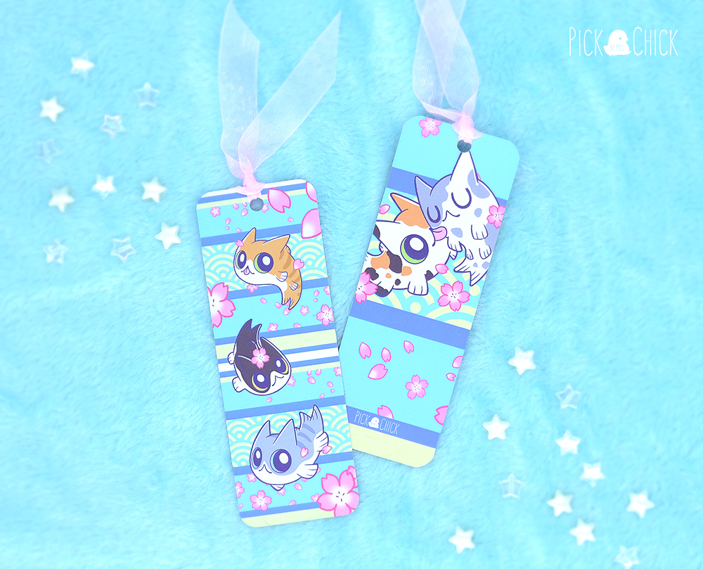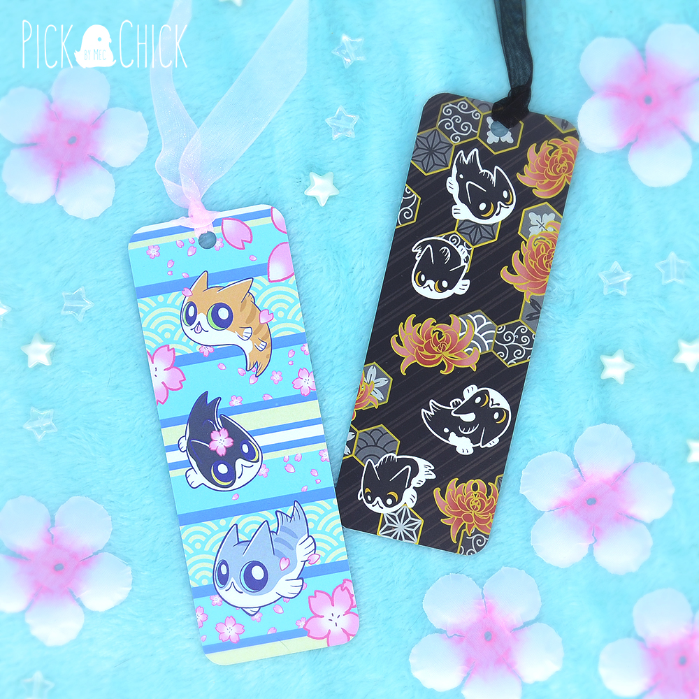Deja que te acompañemos en tus ratitos de lectura con nuestros marcapáginas inspirados en Nekoi, nuestros gatito-pez exclusivos de la marca. Hay dos modelos disponibles, ambos inspirados en Nekoi y en las telas de kimono japonesas. Puedes elegir el que más te guste o llevarte los dos a un precio especial. El primero (azul) es un diseño en tonos vivos y alegres, decorado con pétalos y flores de sakura y distintos tipos de Nekoi. El segundo es más elegante, en colores negro, rojo y dorado con la versión de Nekoi gato esmóquin. Ambos modelos tienen un diseño diferente en cada cara.