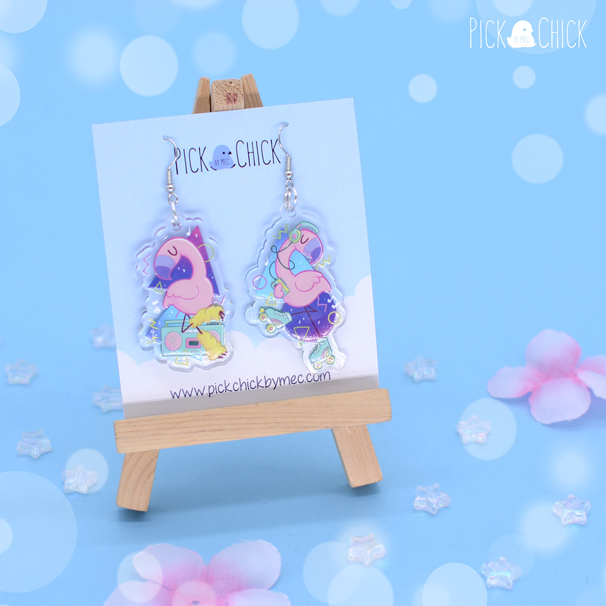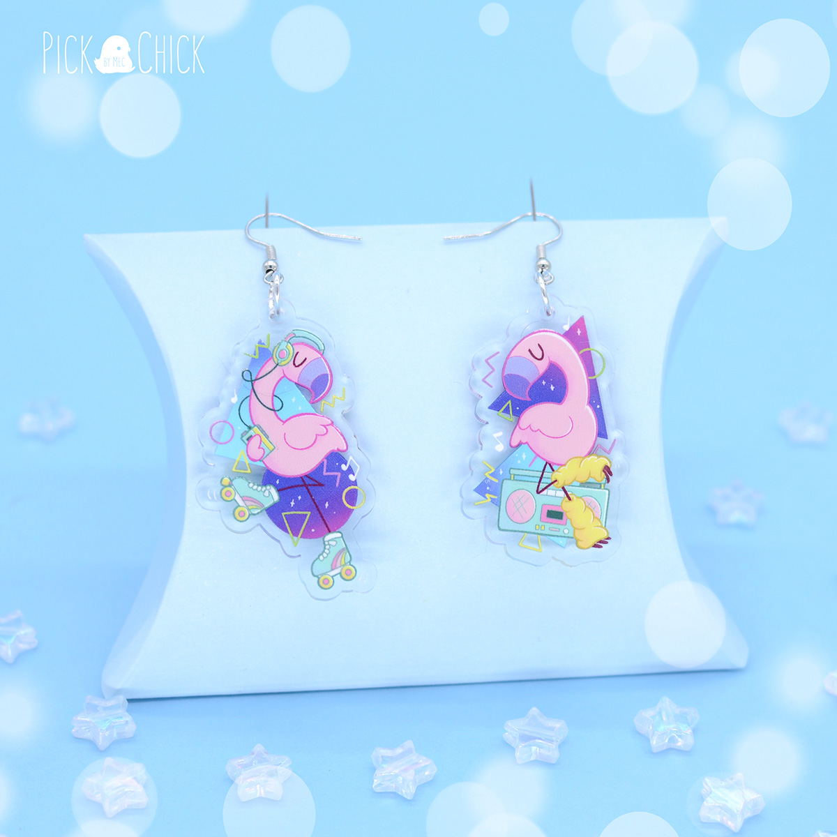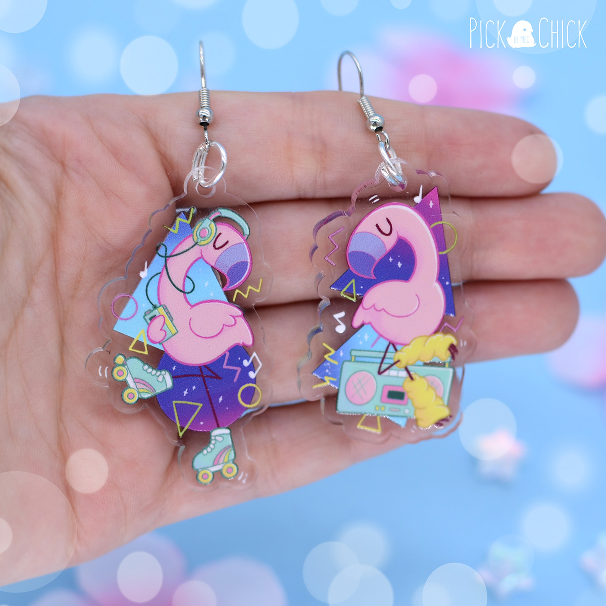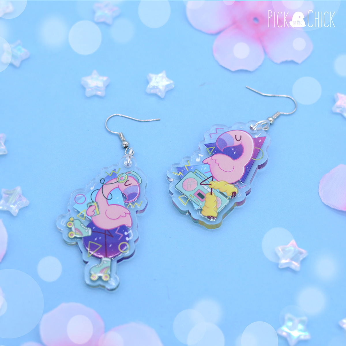 Pendientes acrílicos inspirados en flamencos y en los años 80. De diseño alegre y divertido, estos pendientes son la imagen de los ochenta. Las dos piezas son diferentes. Tenemos a un flamenco andando en patines y escuchando música con su walkman, y a otro practicando aerobic con el loro y calentadores. Ambos combinan los degradados morados y fucsias con formas abstractas neón, todo elementos típicos de los años ochenta. Prueba a llevar los dos a la vez o combinarlos por separado con otros pendientes que tengas por casa. No dudes en hacerte con estos pendientes tan fiesteros, le darán un toque retro, gracioso y adorable a tu outfit cuando salgas de fiesta.